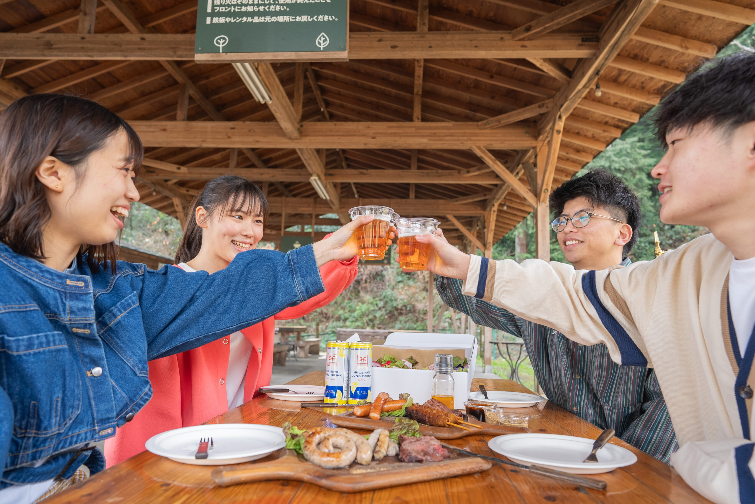 木々に囲まれた緑あふれるBBQ場で、森の優しい風に包まれながら火を囲む。