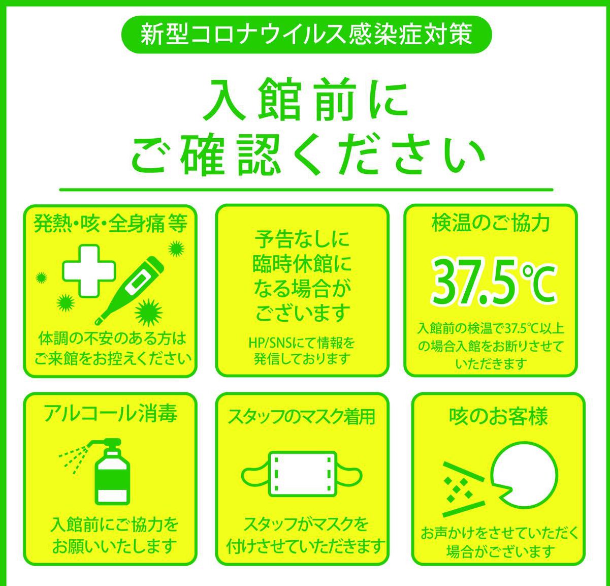 37.5度以上の発熱が認められた場合、保健所の指示に従い、ご入館・ご宿泊をご遠慮いただく場合がございます。