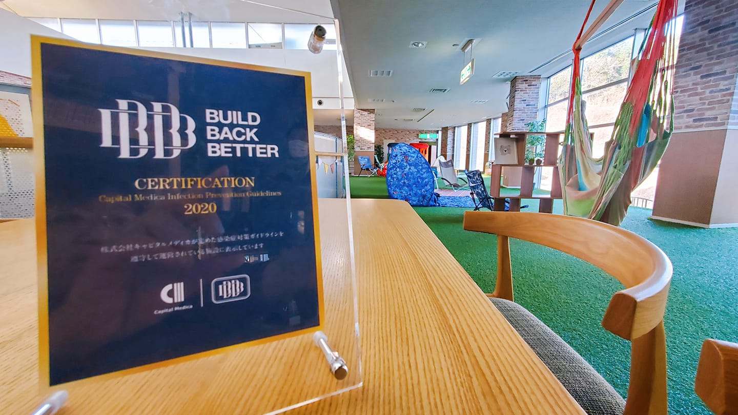◼安全を確保した運営体制の整備のため、キャピタルメディカに COVID-19 感染防止対策のガイドライン策定を依頼、ガイドラインを遵守して運営されている施設に付与される「BBB(ビルド・バック・ベター)認定証」を取得しました。