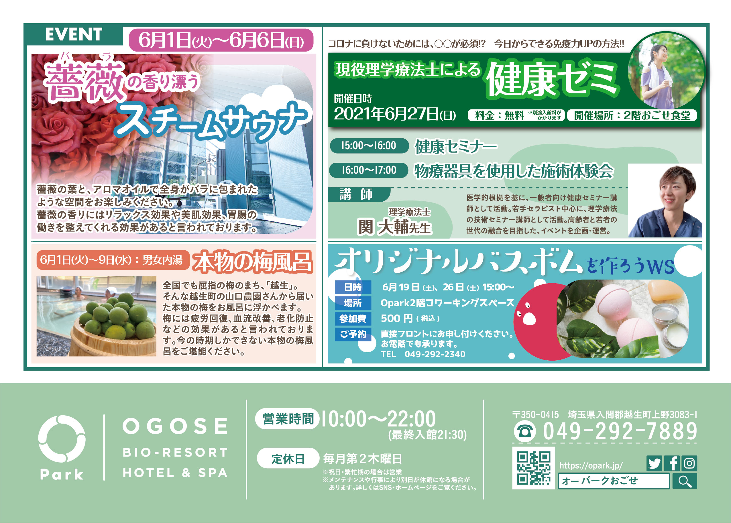 TOPICS 2021年6月イベントカレンダーのお知らせ 2021.05.26 お知らせ −−−−−−−−−−−−−−−−−−−− BIO-RESORT HOTEL&SPA O Park OGOSE ビオリゾート ホテル&スパ オーパークおごせ 埼玉県入間郡越生町上野3083-1 −−−−−−−−−−−−−−−−−−−−