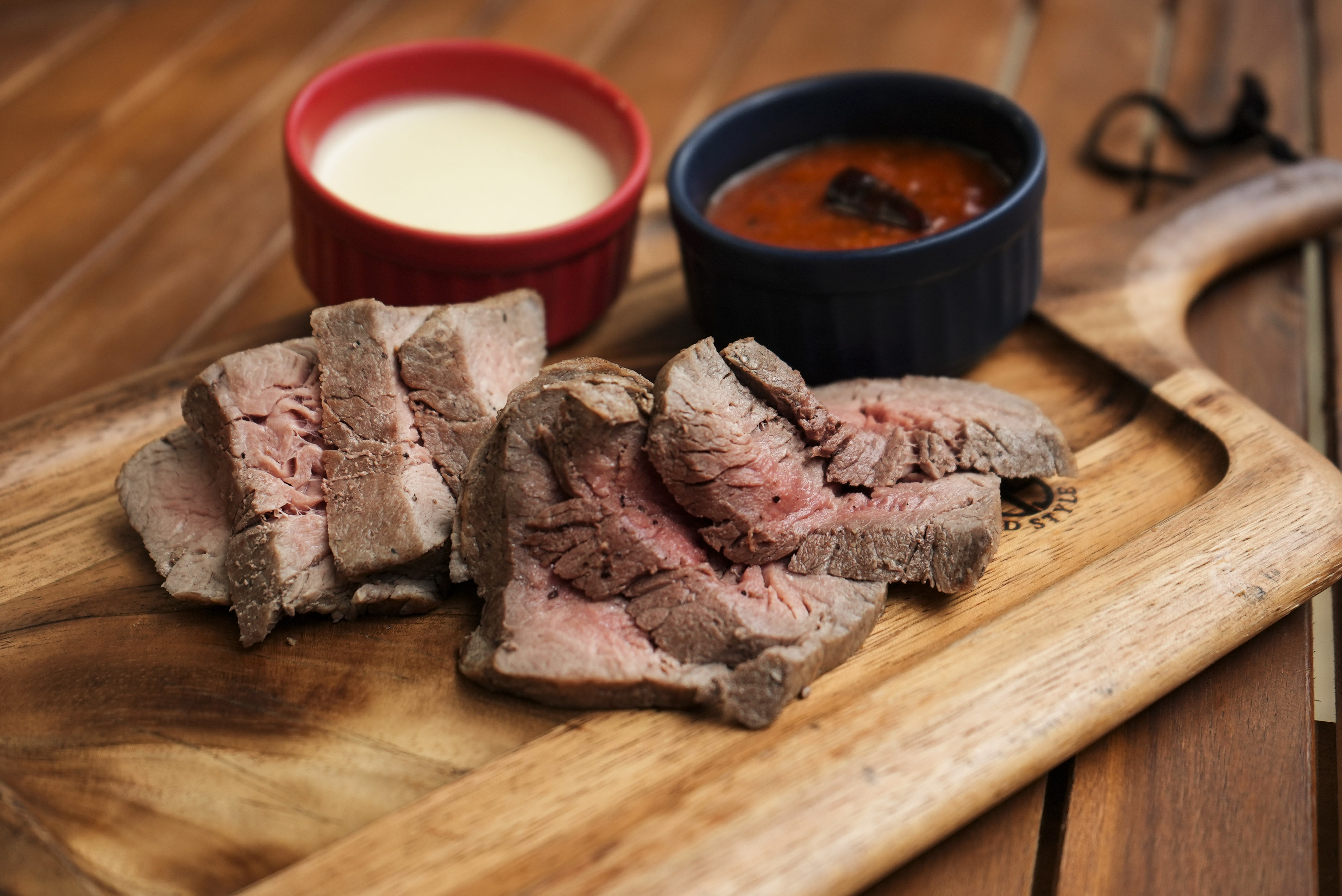 国産和牛をお好みの焼き加減で専用グリルで、そのまま塩コショウのみのシンプルな味でも2種のソースを交互に付けてもオススメです。