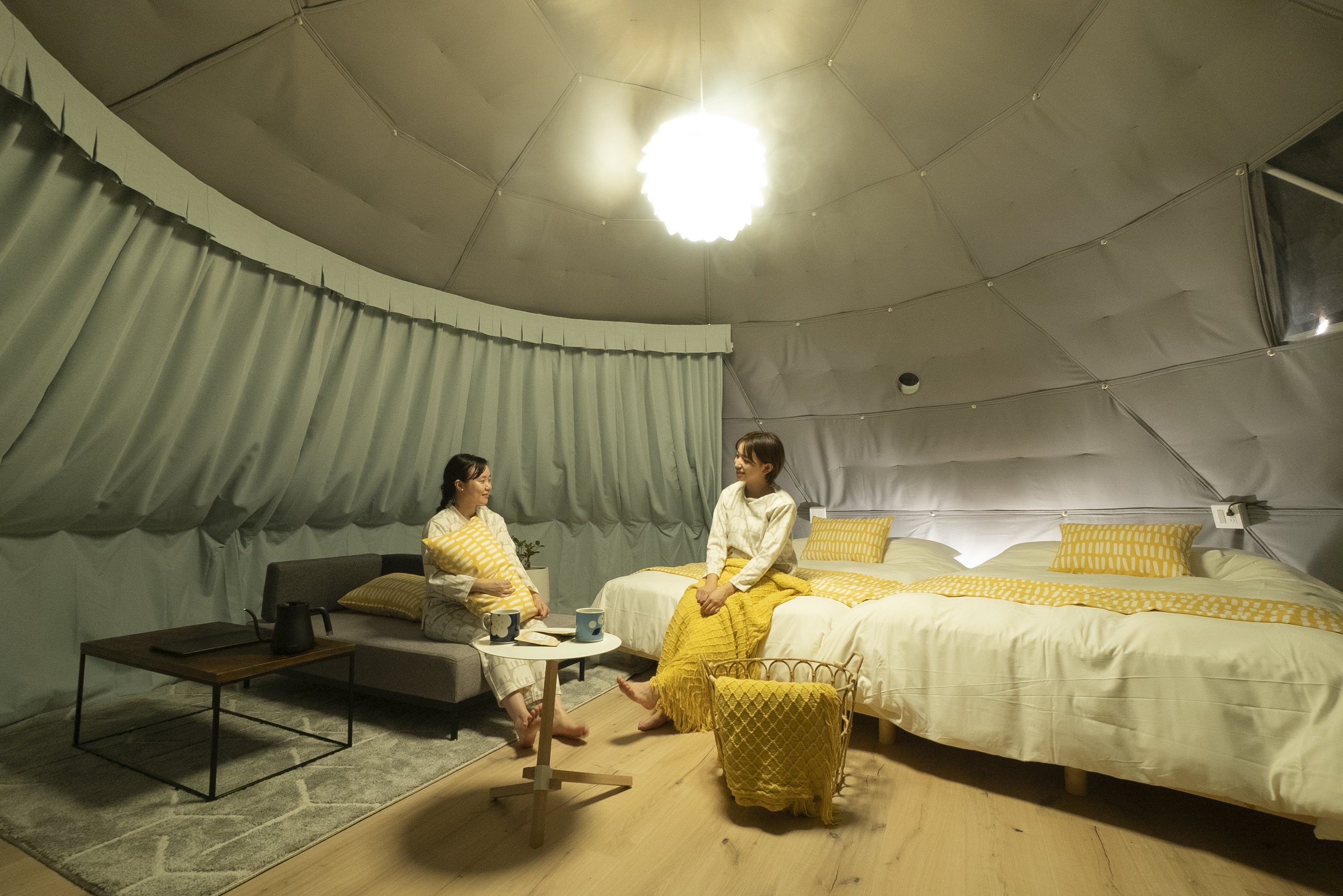ドーム型のかわいらしいフォルムの中は北欧家具やアイテムが並ぶシンプルながらも快適な空間です。