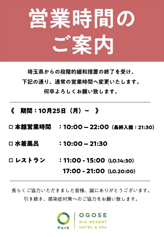 この度 埼玉県の段階的緩和措置等の終了を受け、下記の通り、通常の営業時間へと変更いたします。
