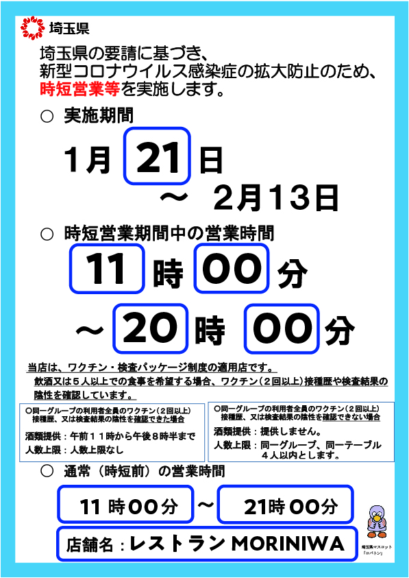 この度、2022年1月21日(金)に埼玉県におけるまん延防止等重点措置に基づく協力要請を受けまして、