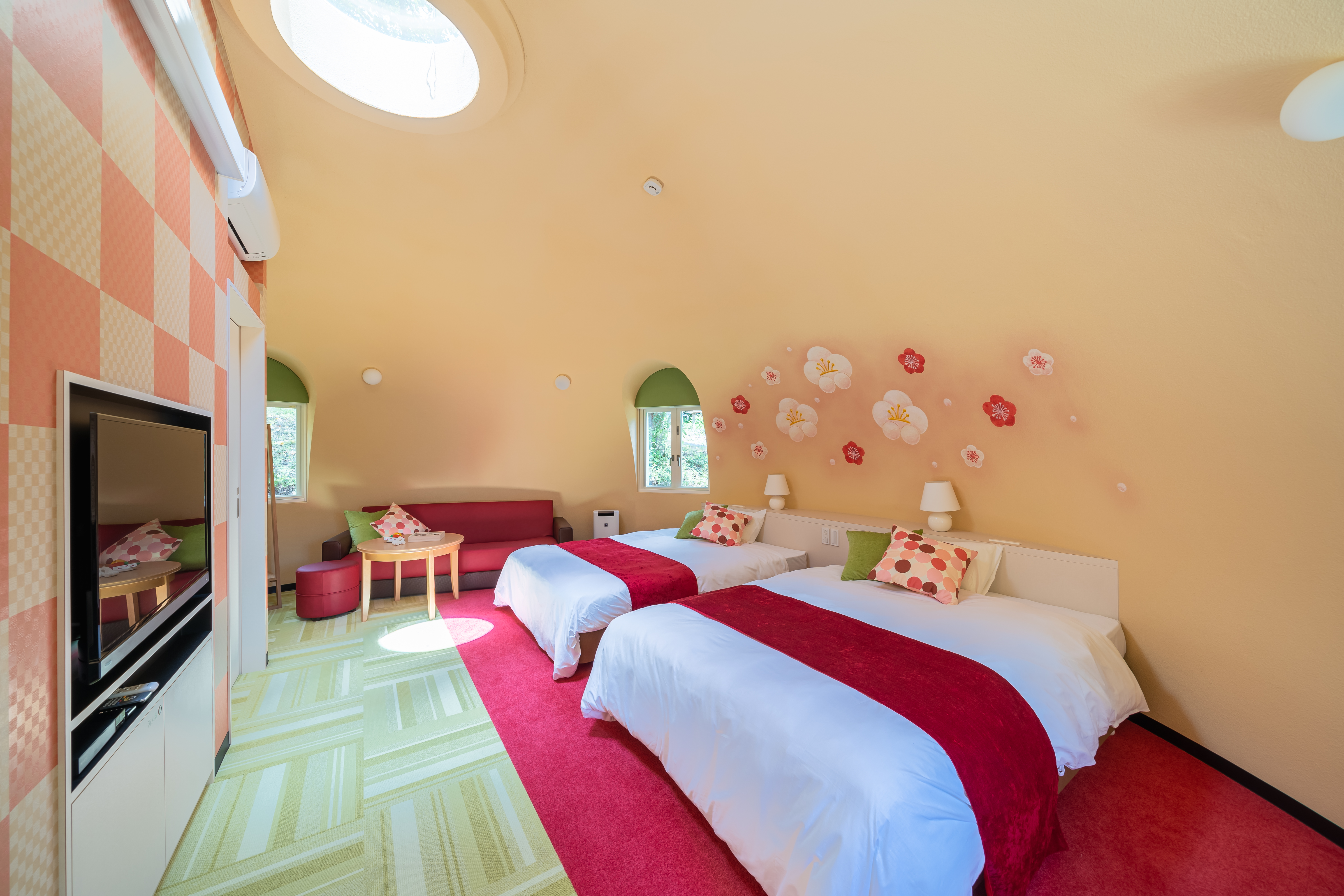 【地元の”うめりん” “もろ丸くん”が描かれた子供たちと快適にグランピングができるお部屋】