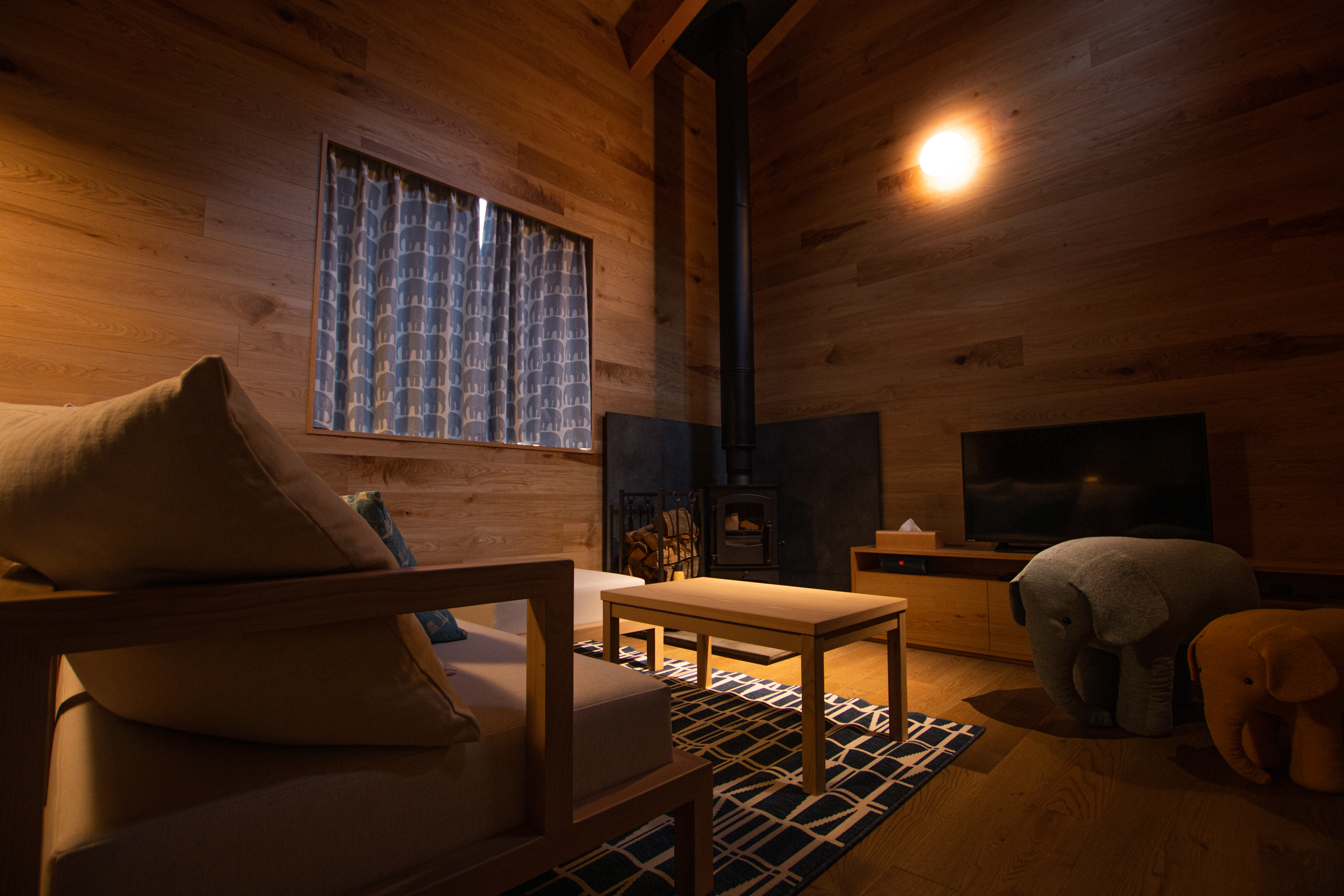 〈設備〉セミダブルベット2台(140cm/195cm)、シングルベット2台(97cm/195cm)、ソファーベッド、システムバス、サウナ、トイレ、洗面台、冷蔵庫 248ℓ、IHコンロ、エアコン2台、電源、テレビ、フリーWi-Fi、部屋内テーブル、椅子、アロマディフューザー、薪ストーブ、スピーカー、プロジェクター