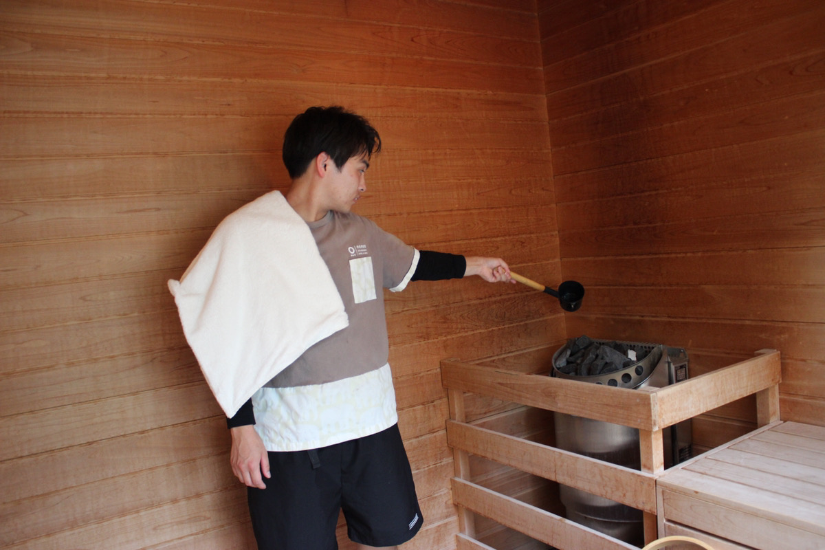 サウナストーンから発生させるロウリュ(蒸気)とタオルワークでサウナ室の温度や湿度を調整し、