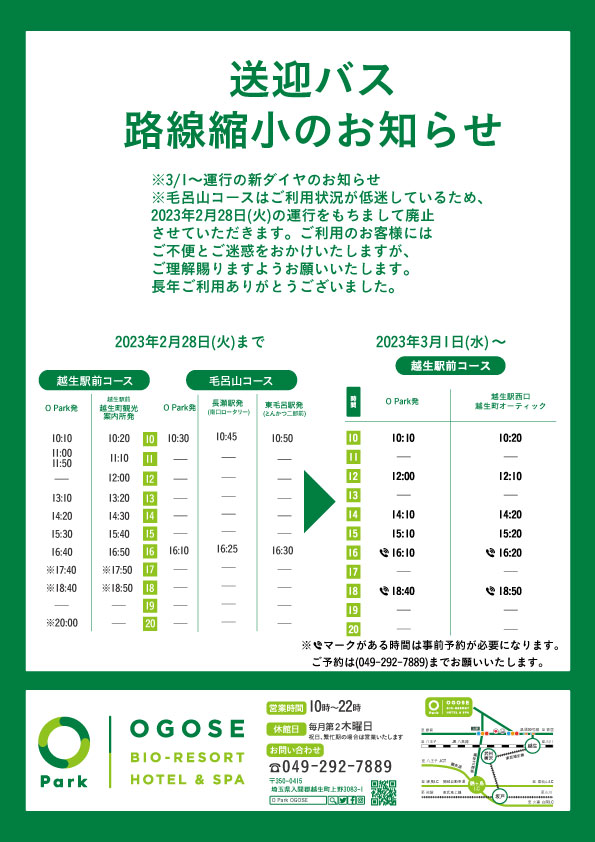この度、2023年3月1日より、オーパークおごせへの送迎バスにおきましてダイヤ改正および系統廃止いたします。