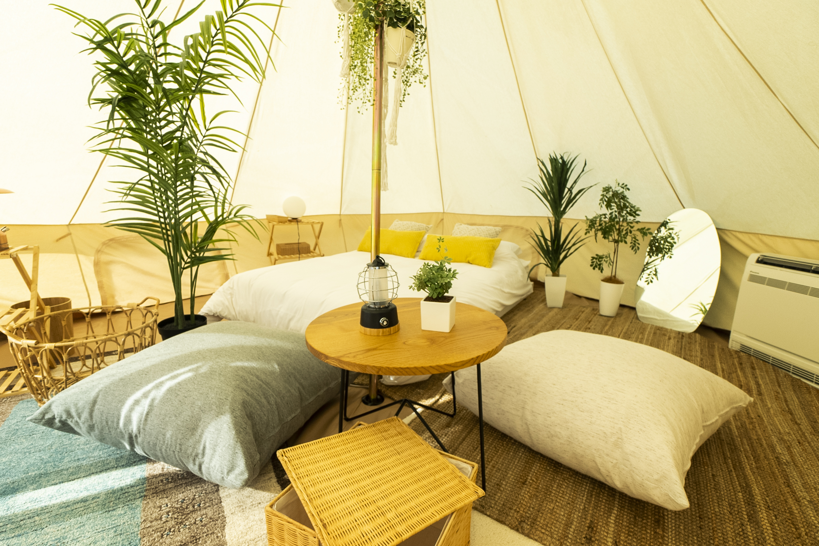 自然光が透過するコットンテント。この季節は暖かい日差しが気持ちが良く、