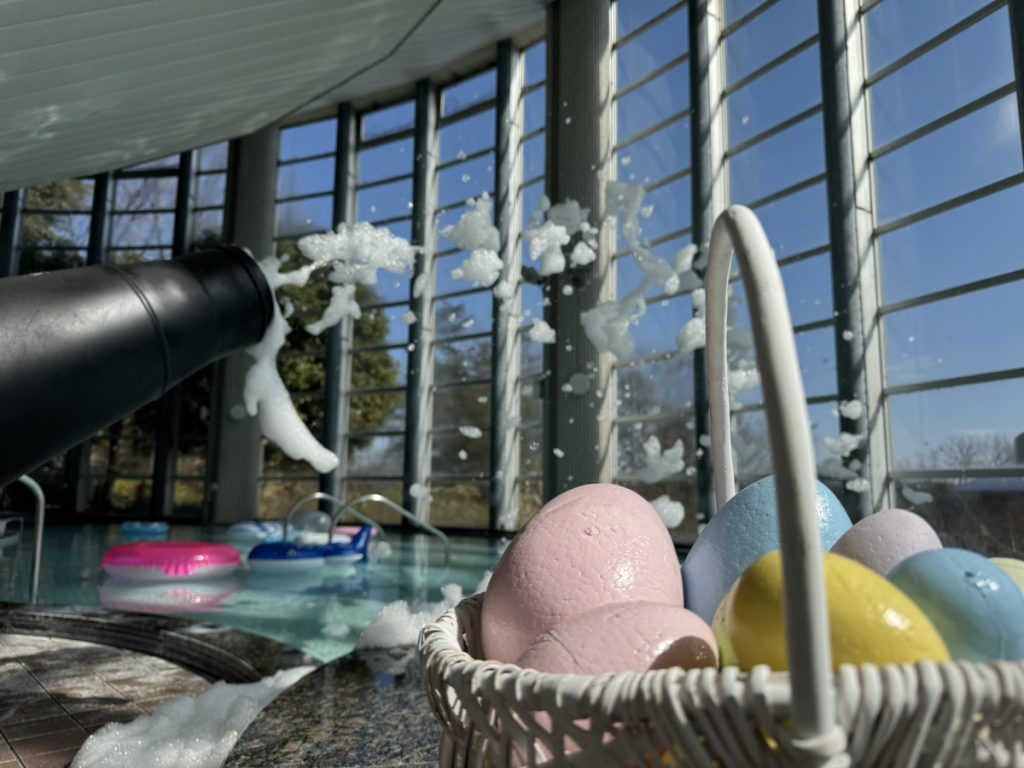 イースターにちなんで、泡バズーカと一緒にカラフルなイースターエッグが飛んできます!