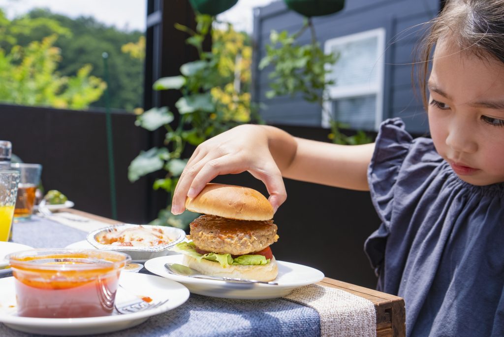 小学生以上のお子様を対象にしたお食事はグリルで焼き上げるハンバーガーセットをご準備。