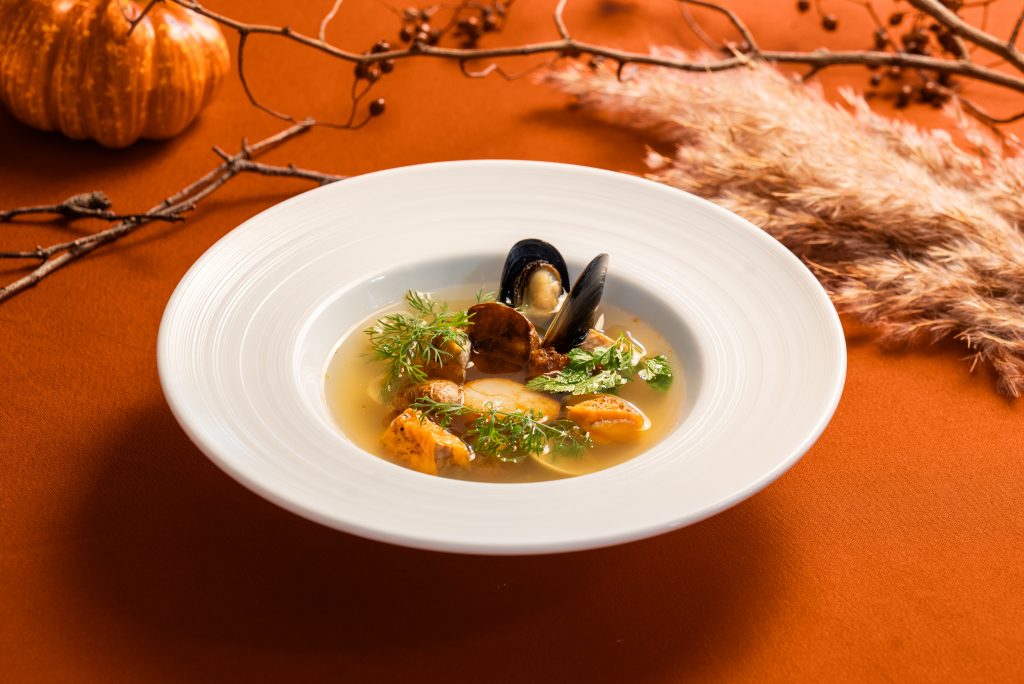 アサリやホタテ、ムール貝などから出汁を取った旨味たっぷりの澄んだスープに、脂ののったノルウェーサーモンとほくほくのジャガイモを合わせました。