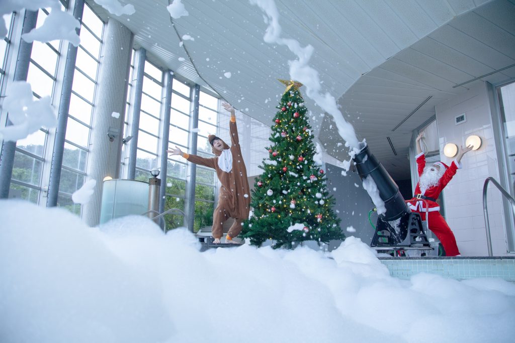 男女で一緒に入れる水着風呂エリアには大きなツリーが登場。もふもふなミルキー泡と陽気な音楽に合わせて、サンタさんと一緒に楽しみましょう!