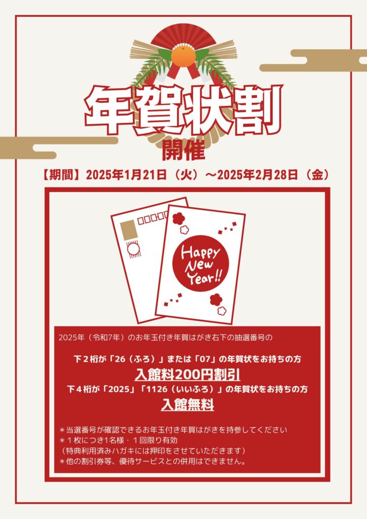 ②下4桁が「2025」「1126(いいふろ)」の年賀状をお持ちの方、入館無料