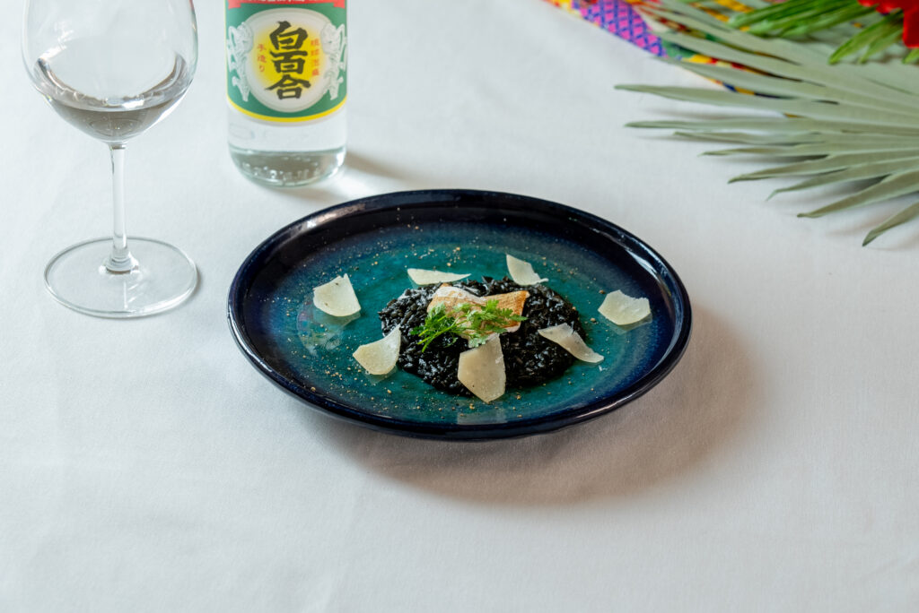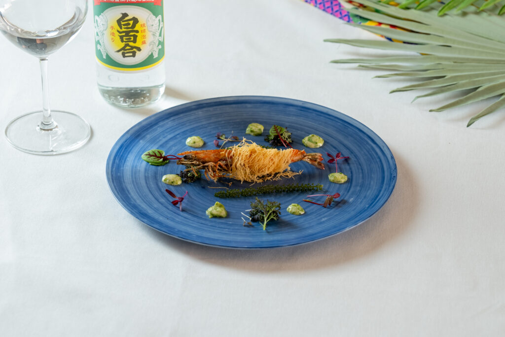 竹富島の車海老やセーイカ、石垣牛を使ったスペシャルコースメニューを提供。池原酒造「白百合」の泡盛とペアリングでお楽しみいただけます。
