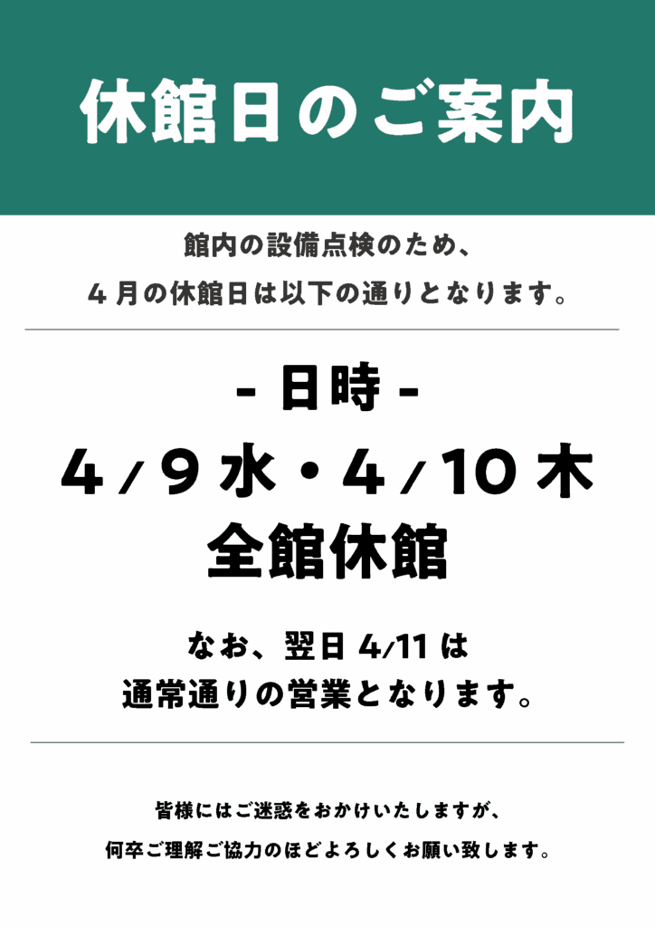 この度、2025年4月から当施設の休館日が変更になりましたことをご案内申し上げます。