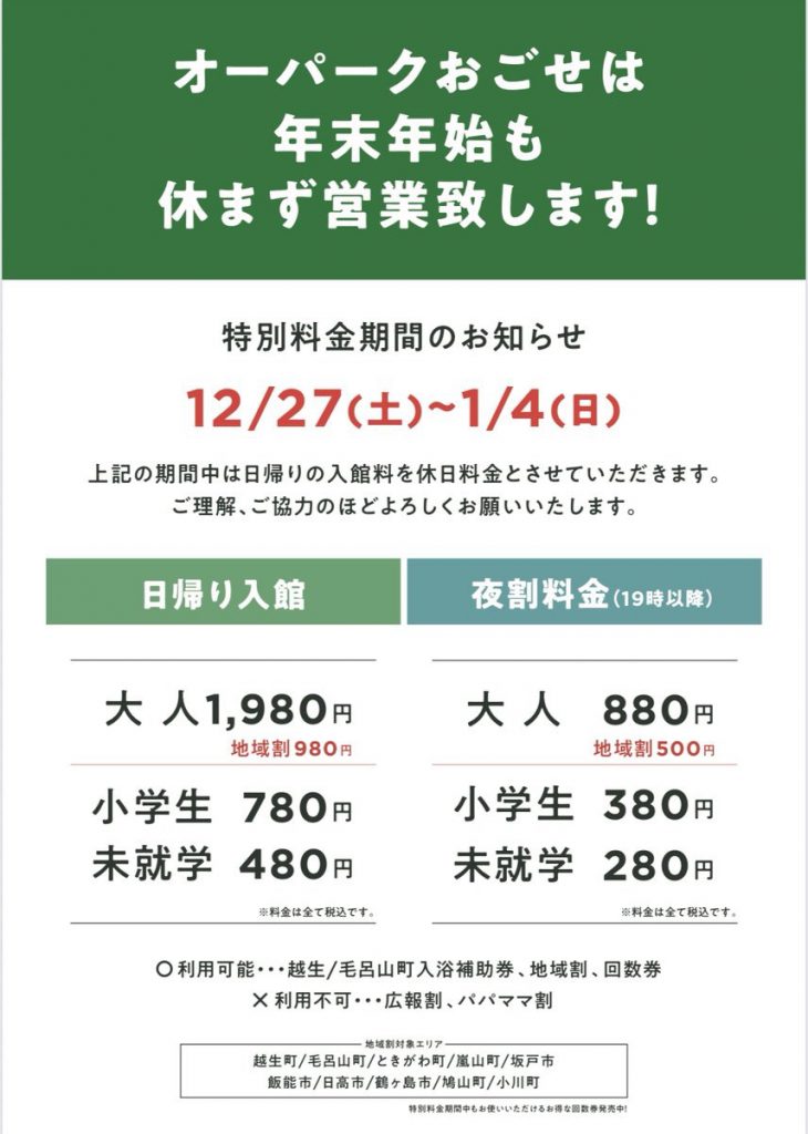 特別料金期間として2025年12月27日(土)~2021年1月4日(日)まで、日帰り入館が通常とは異なる料金となりますので予めご了承ください。