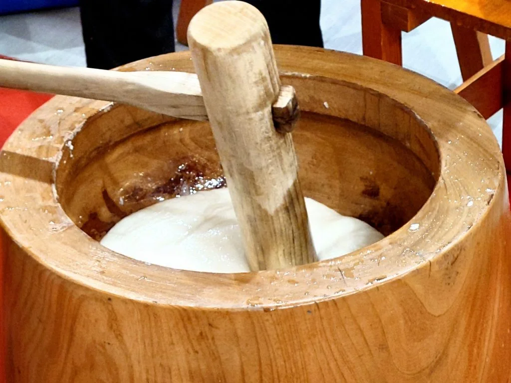 本物の臼と杵でぺったんこ!つきたてのお餅をお楽しみください~!