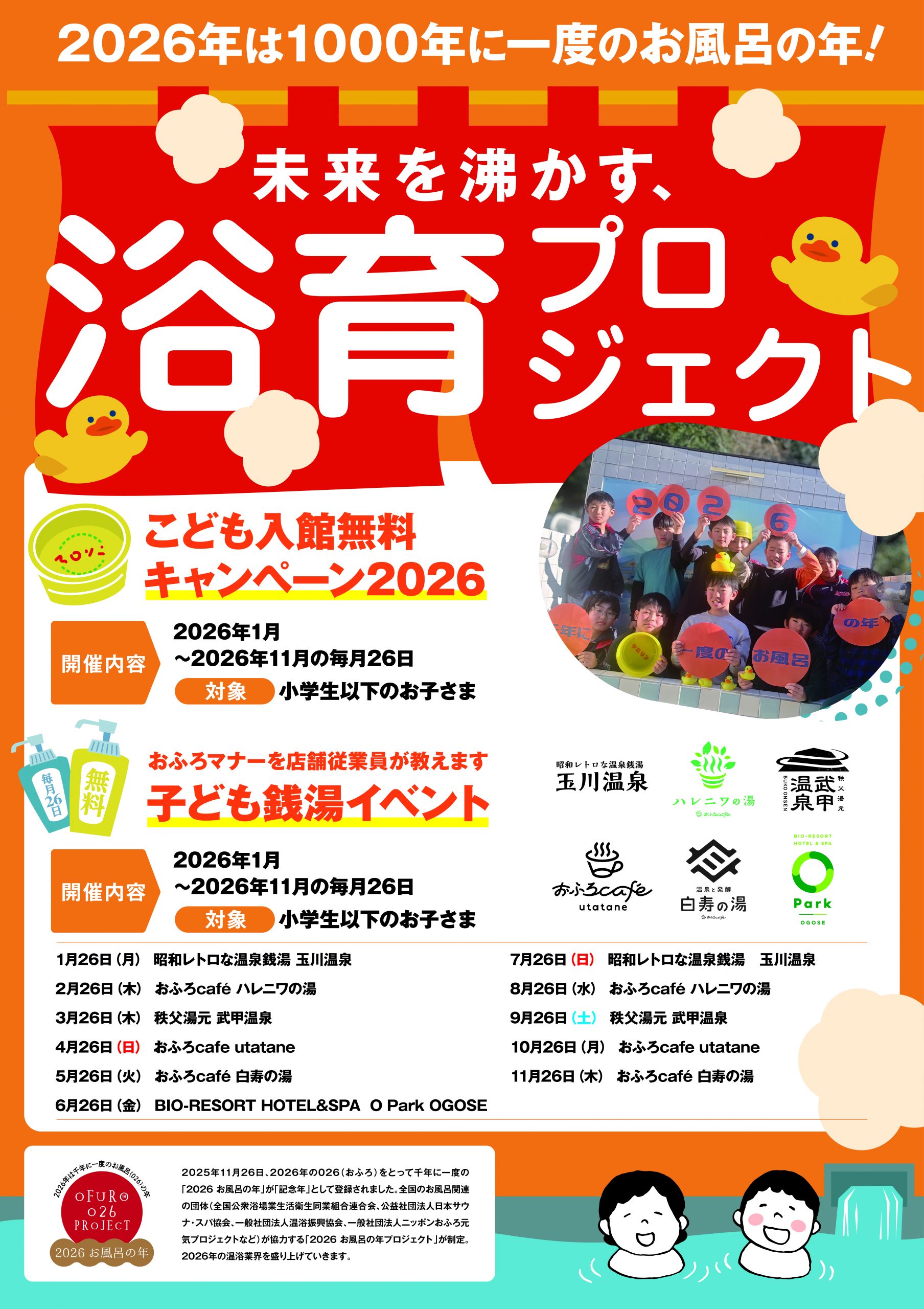 2026年は千年に一度の「お風呂(026)の年」です。「おふろから文化を発信する」を企業理念に掲げる温泉道場は、おふろ文化を次世代に、次の千年へ繋いでいきたい想いから、本企画を開催します。ご家族で気軽に温浴施設・銭湯を利用しながらおふろ文化の体験を通して、多くの子どもたちにお風呂を好きになってもらえればと思います。また、本企画は「2026お風呂の年プロジェクト」に賛同し開催いたします。