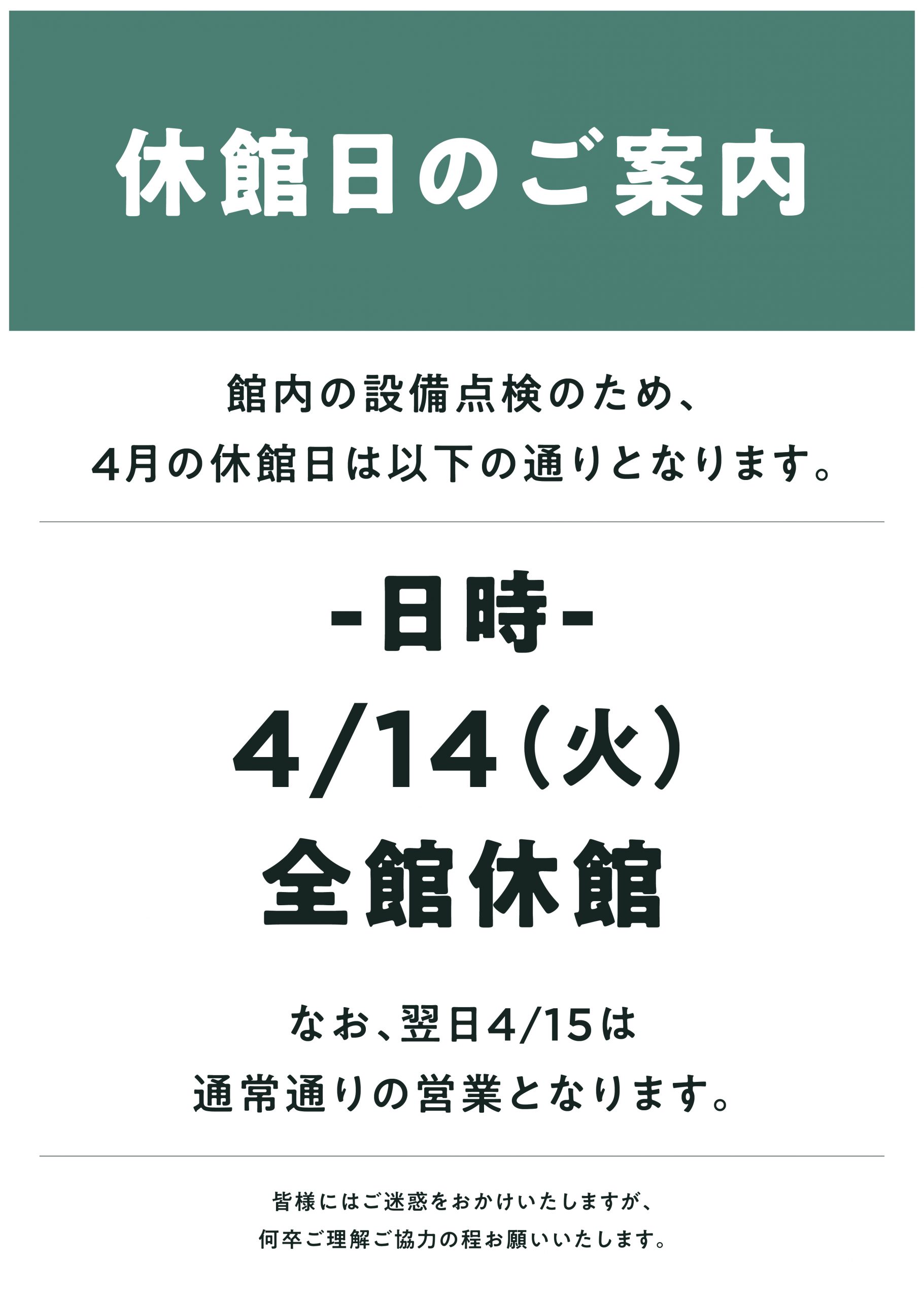 TOPICS 【ご案内】2026年4月休館日のお知らせ