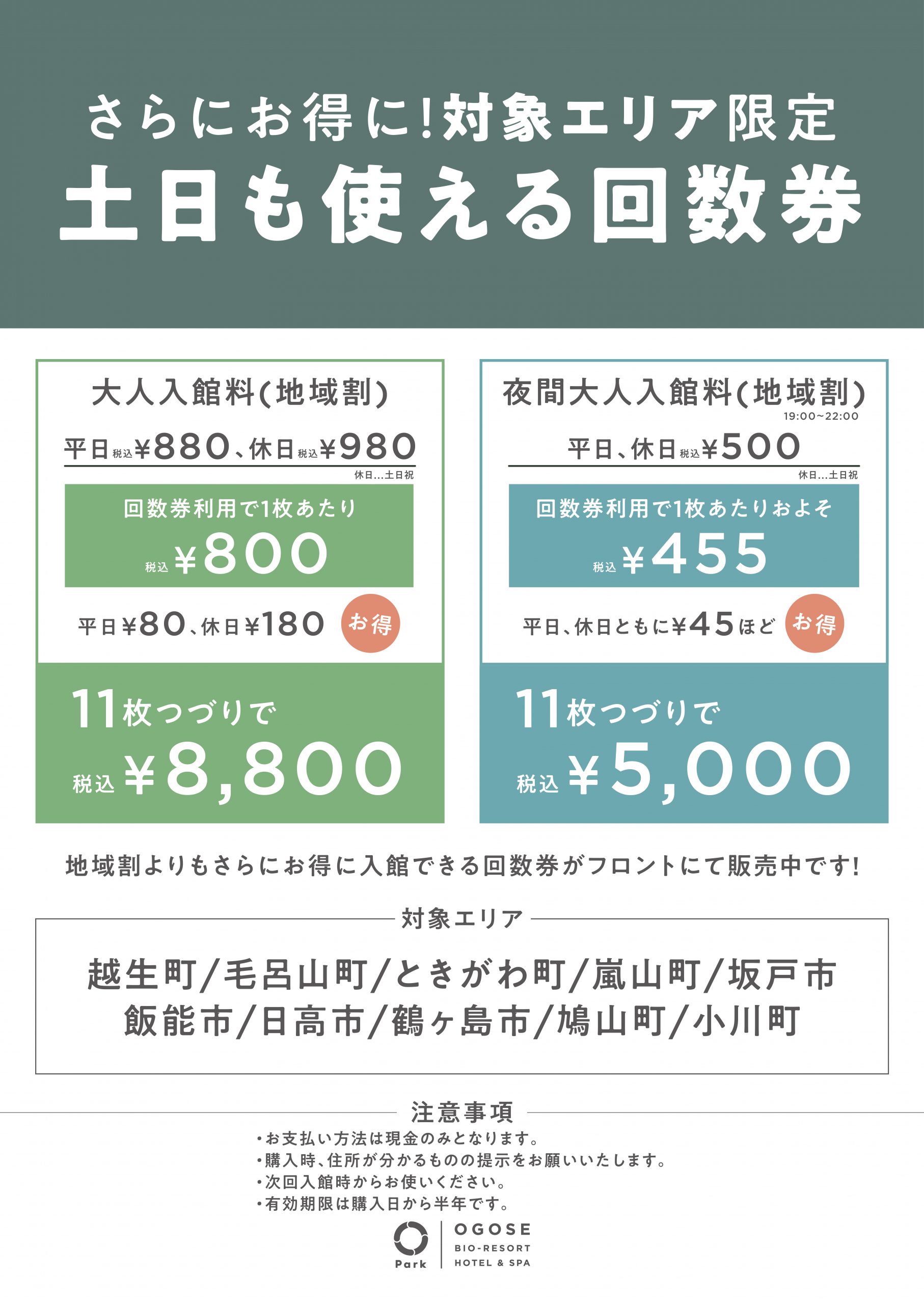 オーパークおごせは毎日お得に入館できる回数券を販売しております。