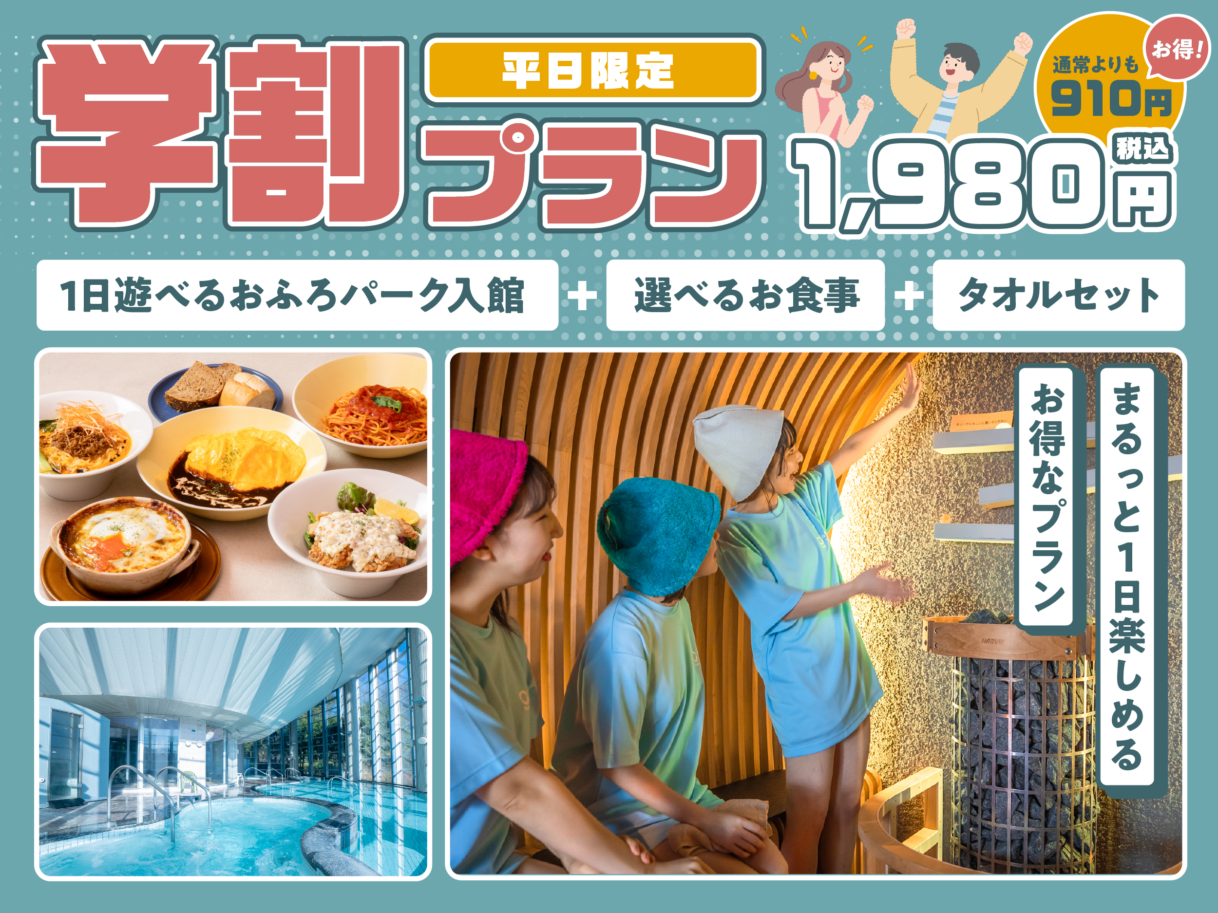 2026年3月2日(月)より、高校生・専門学生・大学生を対象に、平日限定で、入浴とお食事がセットになったお得な「学生限定!入浴+お食事セットの学割パックプラン」を販売いたします。