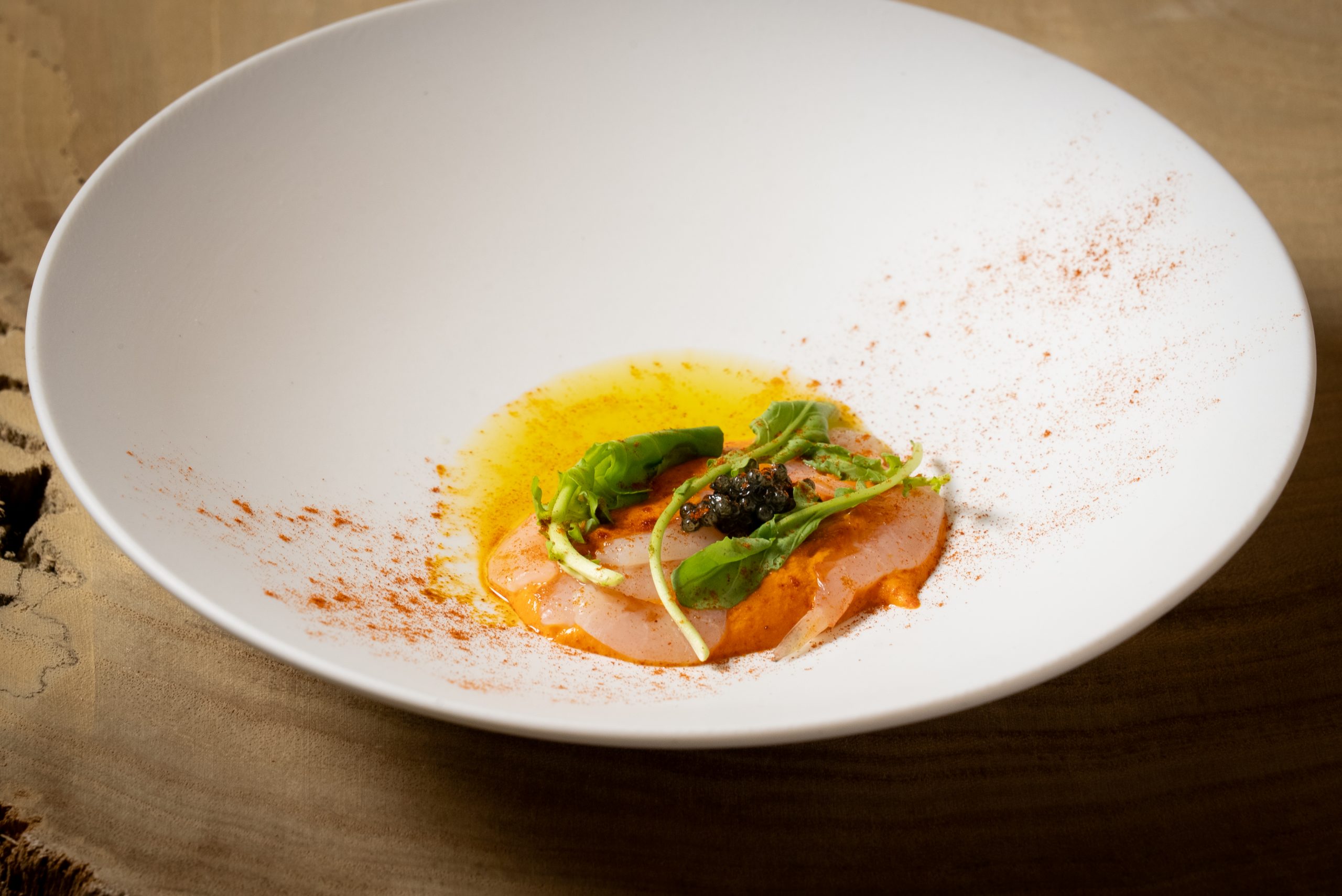 甘味のある人参リゾット、ふっくら仕上げた石垣島のハタ、甲殻類の旨みを濃縮させたアメリケーヌソースとともに。